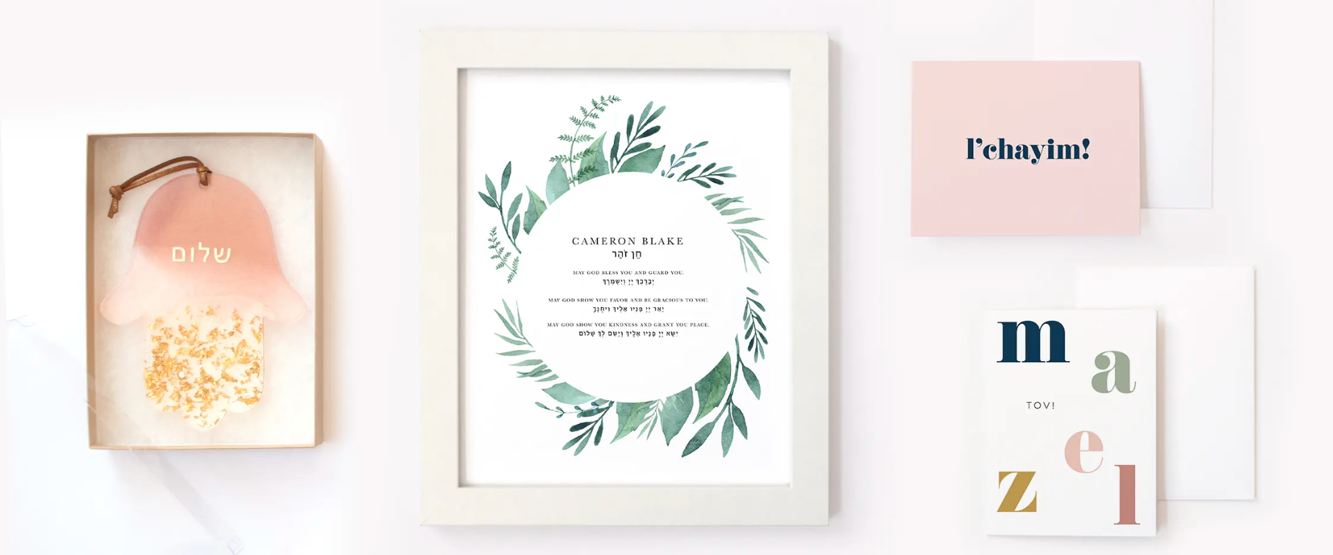 Shop for the perfect gift to welcome a new baby like a customized baby blessing, Aleph Bet art print or Hebrew name art.