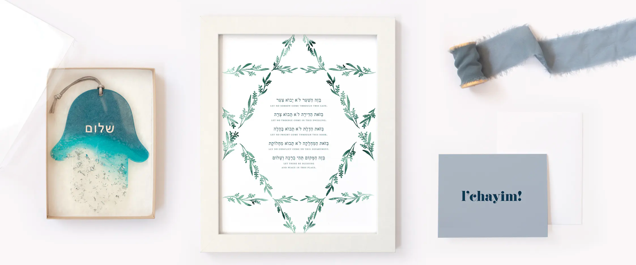 Shop Jewish gifts like hamsa hangings, home blessings, and Jewish serving trays.