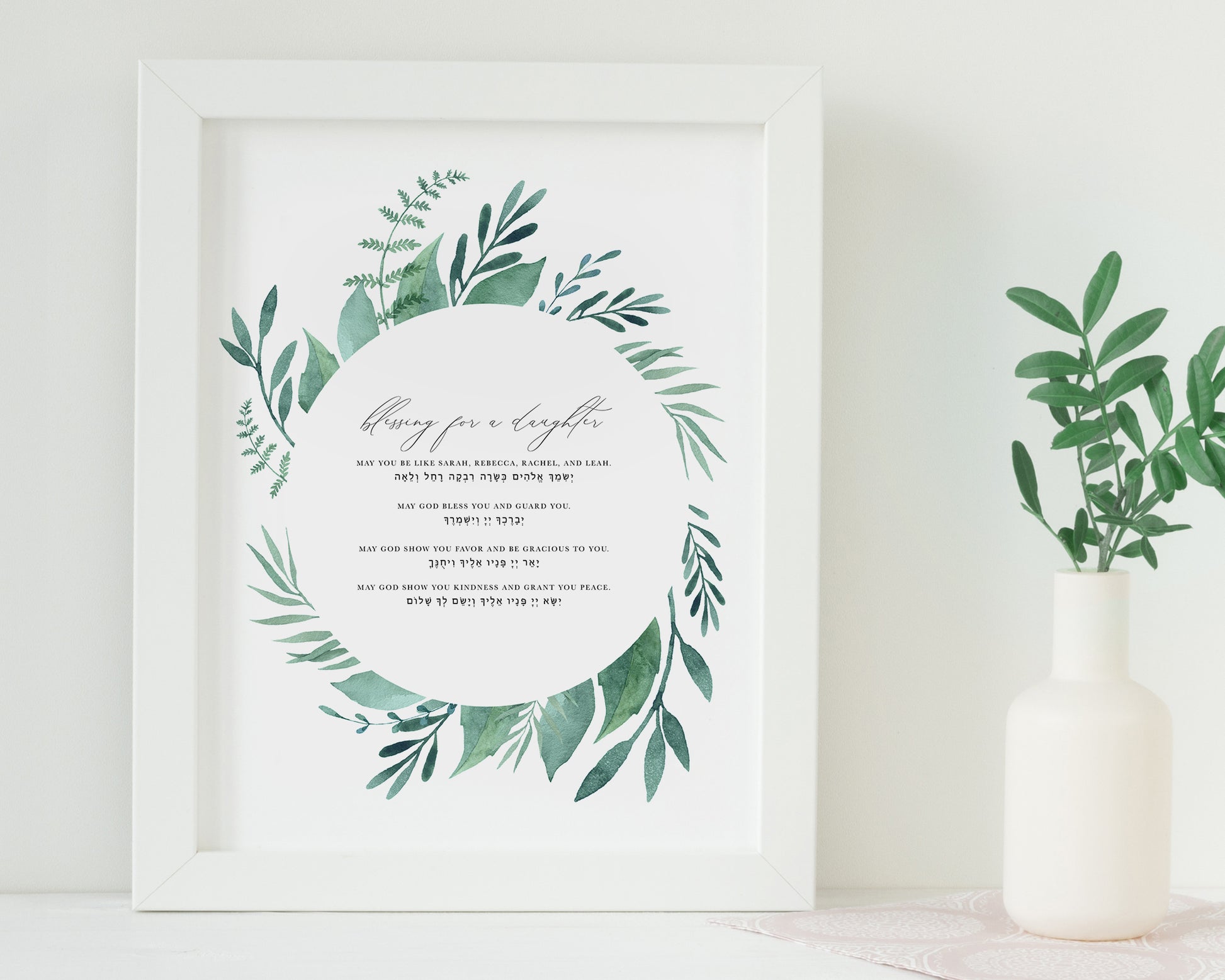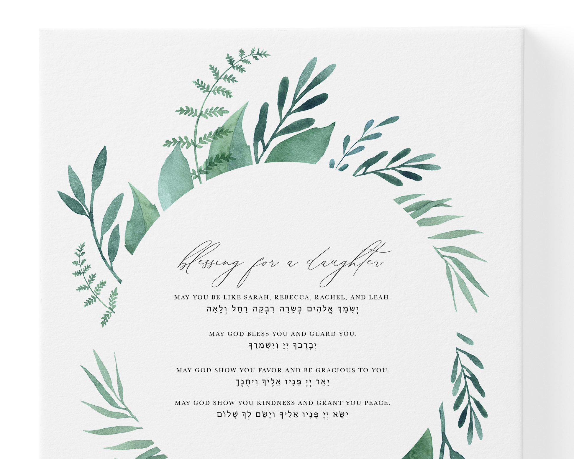 The blessing for a daughter reads: "May you be like Sarah, Rebecca, Rachel, and Leah. May God bless you and guard you. May God show you favor and be gracious to you. May God show you kindness and grant you peace."