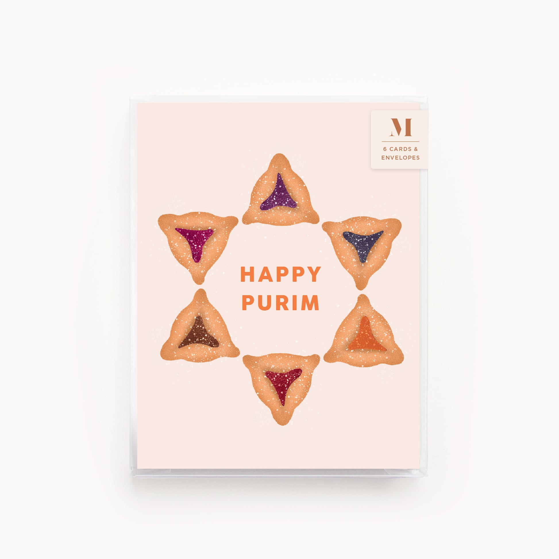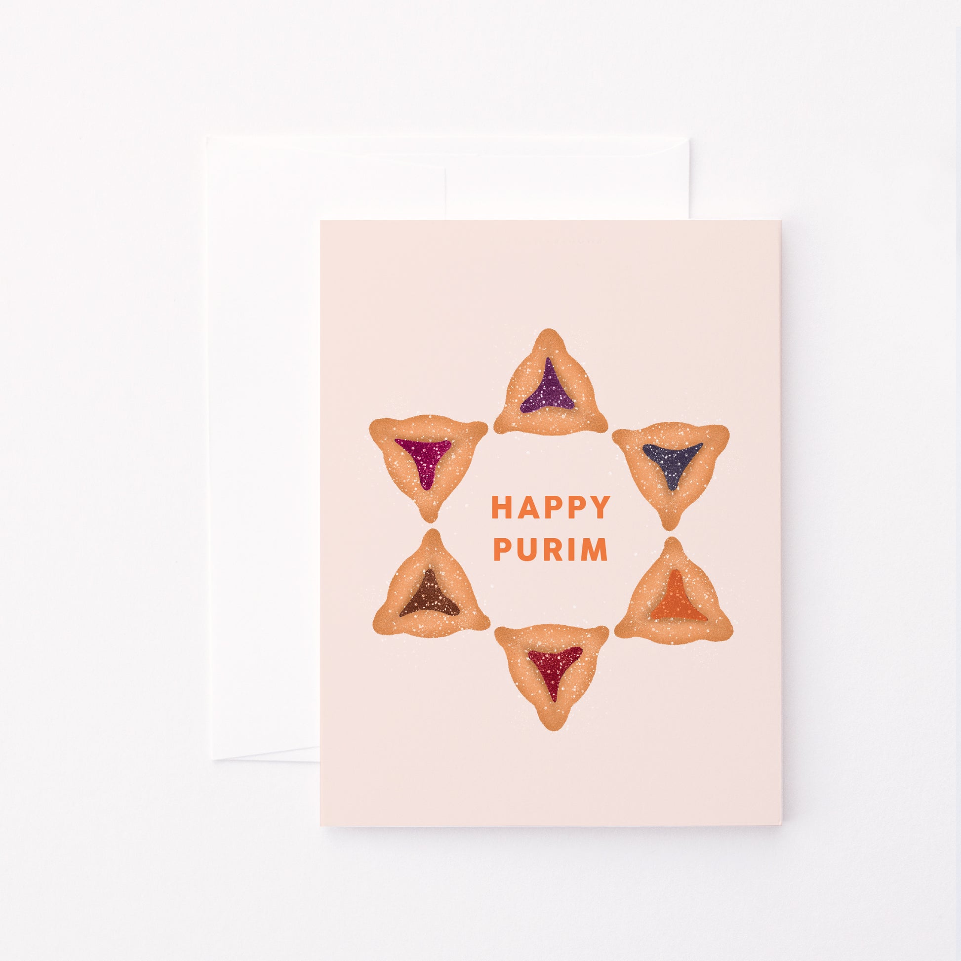 Wish someone a Happy Purim with this Hamantaschen Star of David Purim card. Perfect to add to a Purim basket, Purim Bag, Mishloach Manot, or Shalach Manos.