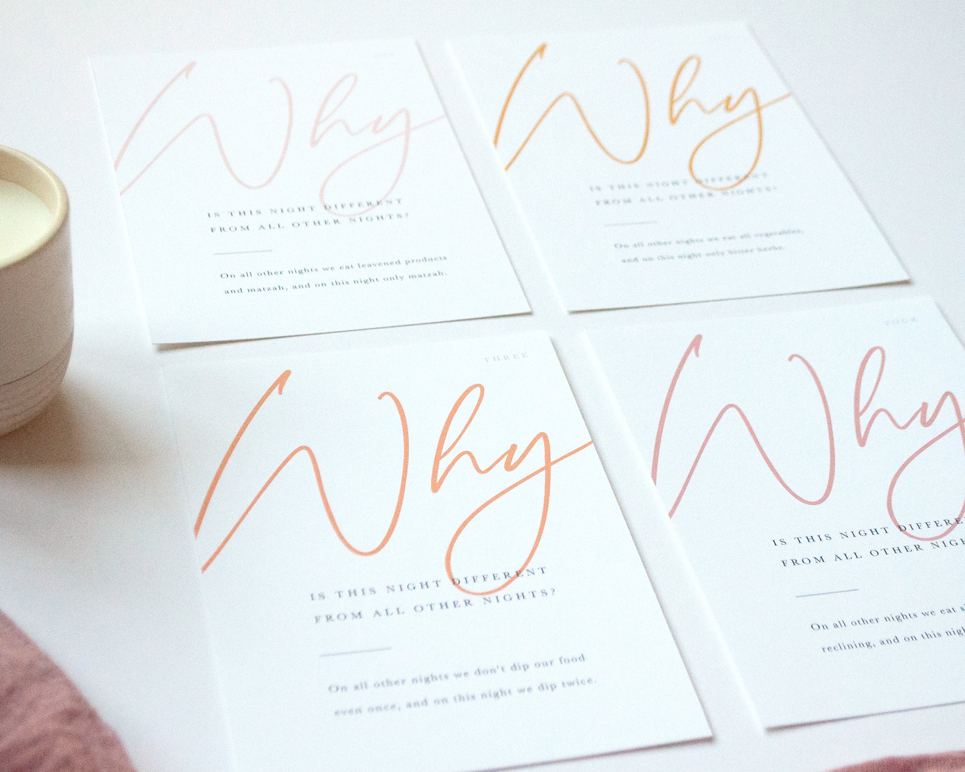 Add these cards to your Passover seder table or use as decor throughout your house during Pesach. The four questions are one of the main focal points of the Passover seder. Use these beautiful, handy cards during the maggid to ask the four questions and talk about why this night is different from all other nights.