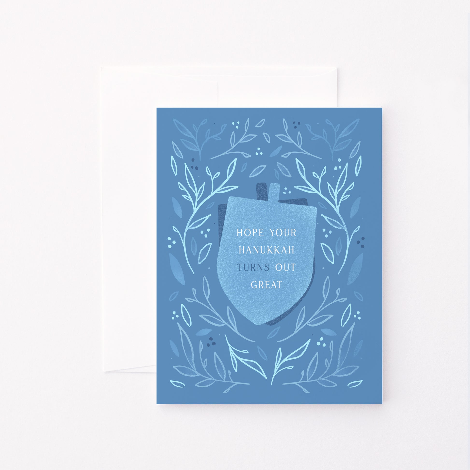 Celebrate the holidays with a festive Hanukkah greeting card featuring a spinning dreidel and a punny greeting "Hope your Hanukkah turns out great."
